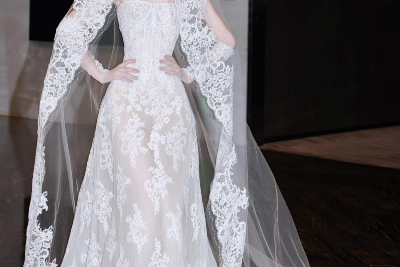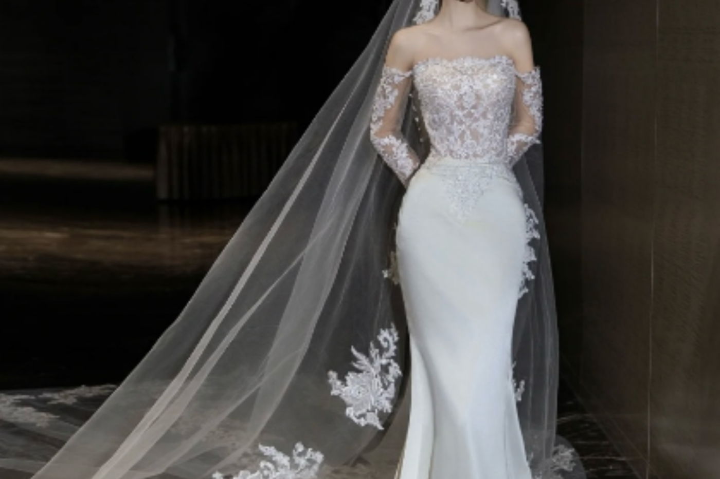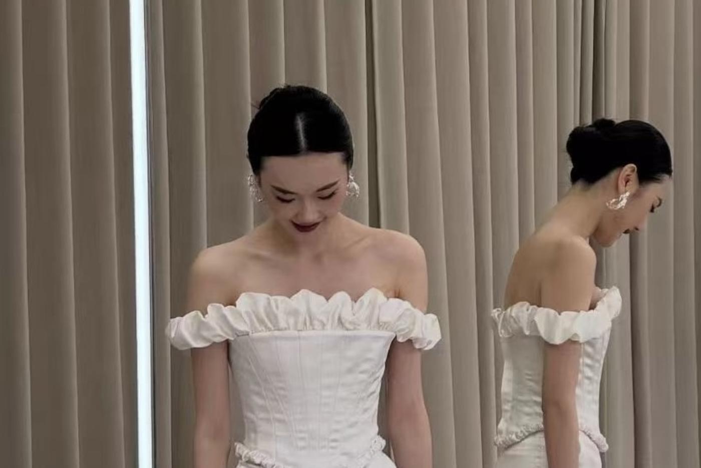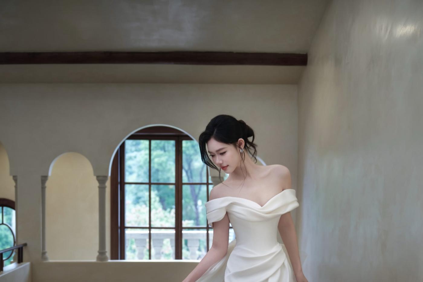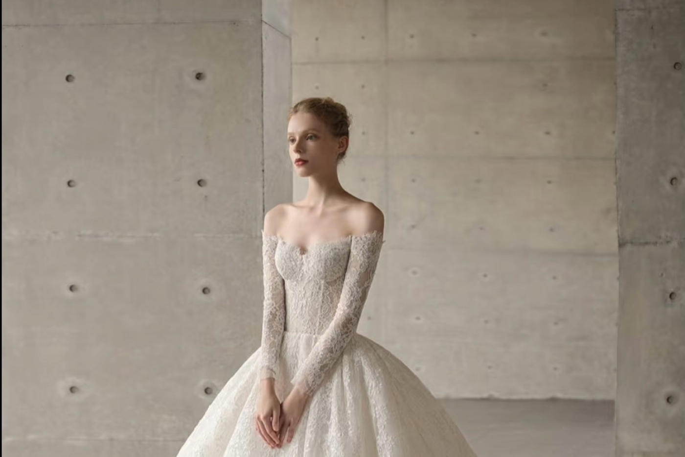 一字肩长袖设计温柔典雅将浪漫发挥到了极致