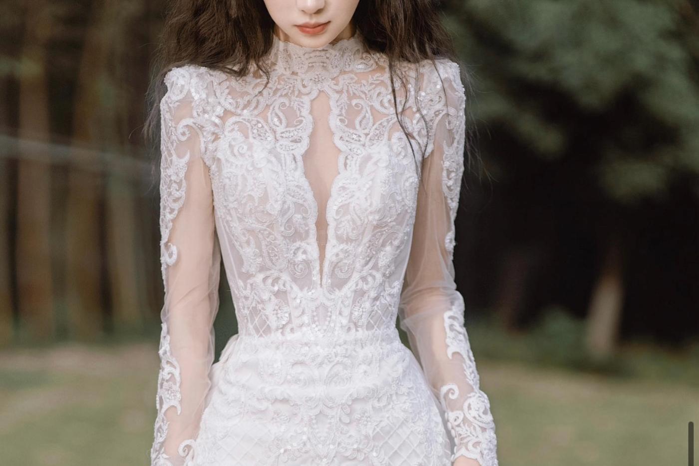 一袭纯白温柔入骨,宛如中世纪的书页里的诗篇,带着隽永的痕迹,走进浪漫主义的遐想之中。 浮雕古典主义蕾丝,温柔绵延,静默不语中萦绕愫愫柔情,呈现出典雅与现代简约碰撞出的唯美与浪漫。 蕾丝深V静止间仙气蔓延,长袖高领复古设计赋予婚纱更多神圣与古典、举手投足自带贵族气场。 莹白珍珠环环相扣,勾勒出玲珑有致的后背曲线,诠释不一样的摩登时尚。可拆卸的拖尾仙气弥漫,带来满满仪式感,随着步伐荡漾出华丽不失清透质感,流动光影之间,散发着摄人心魄的温柔与古典浪漫气息。 [更多…]